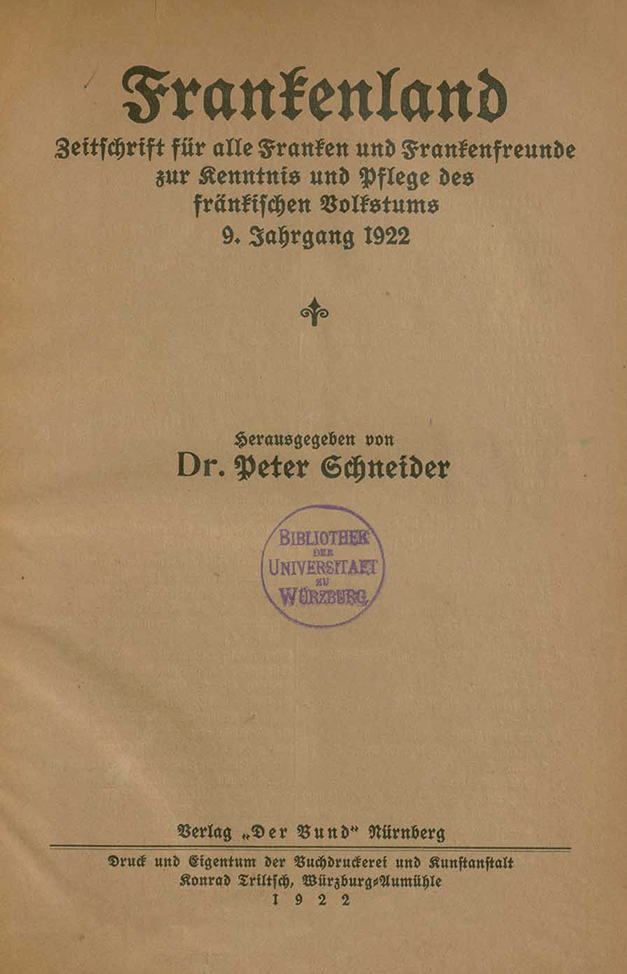 Since 1914, Frankenland has been published under various titles and with changing subtitles. In 1916, the founder of the Frankenbund, Dr. Peter Schneider (1882–1958), took over as editor. From 1923–1926 and 1944–1948 no issues appeared. Despite these temporary interruptions, the Frankenbund continuously published journals under different names (e.g., Mitteilungen des Frankenbundes, Werkblatt des Frankenbundes, Der Frankenbund etc.). Since 1954, the new series of the journal Frankenland has been published.